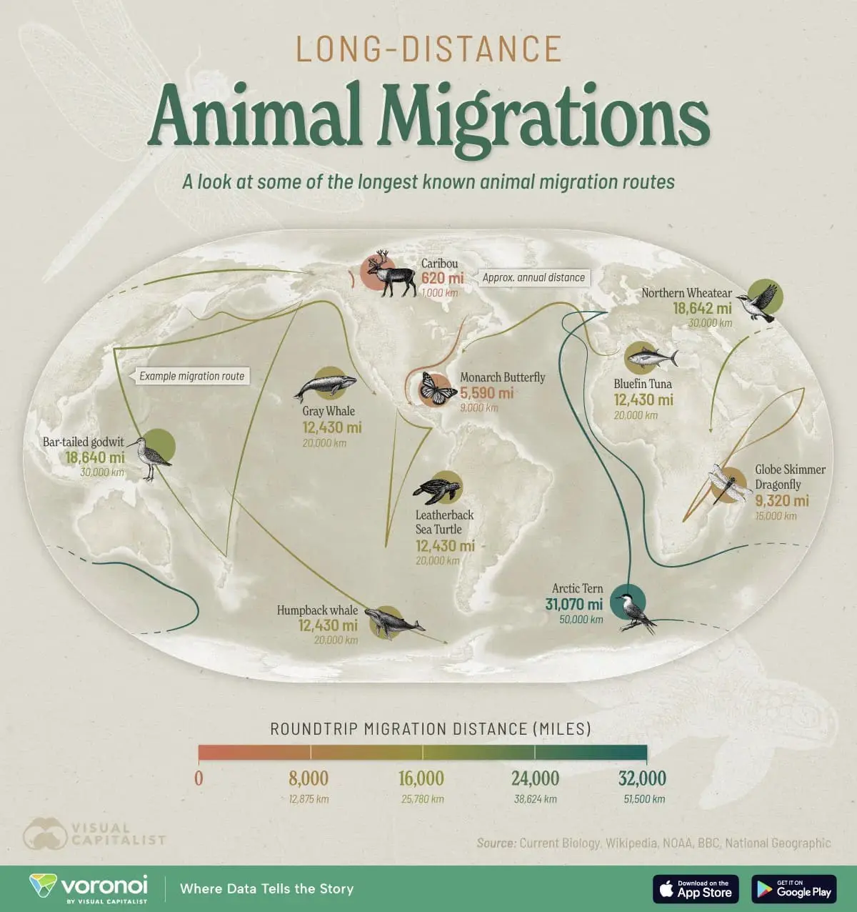 Эта удивительная визуализация раскрывает поистине грандиозные маршруты путешествий обитателей нашей планеты! От головокружительного полета Полярной крачки через полюса до эпических океанских путешествий китов — все эти пути чудесным образом сплетают экосистемы Земли в единую сеть и формируют глобальные пищевые цепочки.