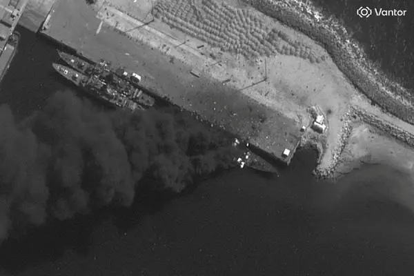 Горящий фрегат на военно-морской базе Конарек в Иране, 28 февраля.  (Vantor / Reuters)